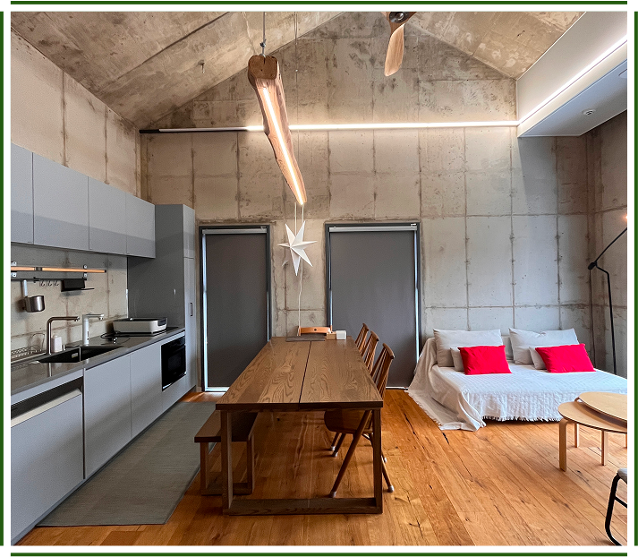 차가운 질감의 석재 벽과 따뜻한 우드 톤 가구가 공간에
